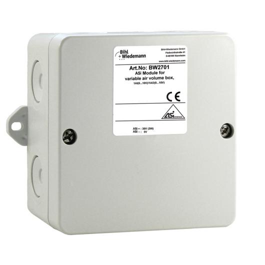 Das ASi Modul zur Steuerung von Volumenstromreglern (sog. VAV Box) erfüllt die Anforderungen der ASi Spezifikation 3.0. Es dient zur Ansteuerung von Volumenstromreglern (0 ... 10 V) durch den analogen Ausgang (0 ... 10 V).