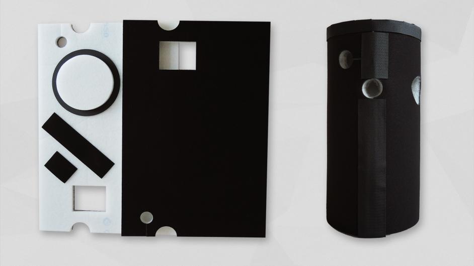 Außen: Vollflächig klettfähiges Velours zur individuellen Befestigung mittels Klettstreifen. Innen: Kombination aus einem hochabsorbierenden, hydrophoben PES-Vlies zur Schalldämpfung und der Schwerfolie Cello® EVA zur Schalldämmung.