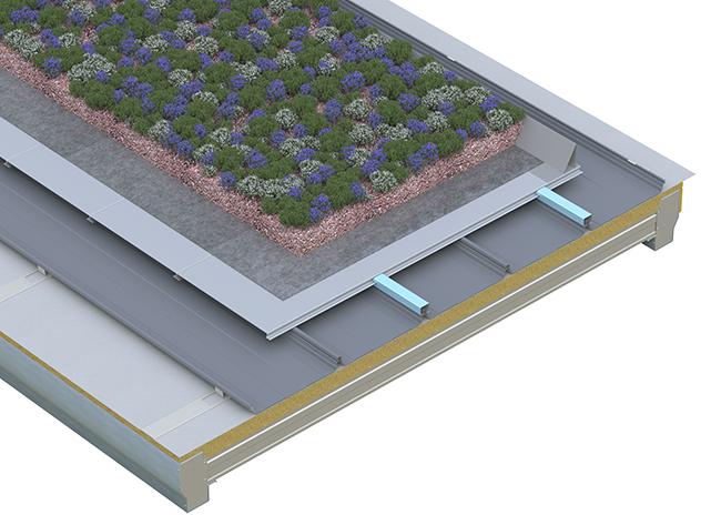Beim Domitec®LivingGreen werden auf das bestehende Domitec®-Dach Vegetationswannen aus Aluminium durchdringungsfrei befestigt. Somit bleibt die dichte Dacheindeckung intakt und die Entwässerung von möglichem Wasserüberlauf findet zwischen Vegetationswanne und der Domitec®-Deckschale statt. Sicher und einfach!