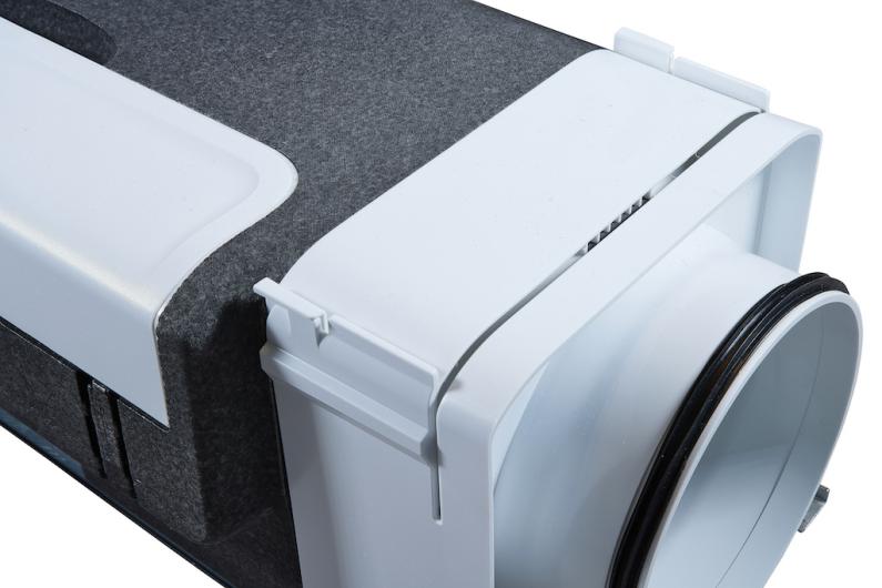 Mithilfe modernster Technologie für die Formschablonen wird die Oberfläche der EPP-Außenelemente mit einer Lasertextur versehen, die zu einem Produkt mit einem höheren ästhetischen Wert beiträgt. An der Innenseite befindet sich ein Einschub, der im Spritzgussverfahren hergestellt wurde. Wie die übrigen, von HSV angefertigten Spritzgussteile passt auch dieses Element nahtlos zu den EPP-Teilen. Am Sockel der Wohnungslüftungsbox (also an einem der Kunststoff-Spritzgusselemente) wurde mithilfe des Tampondrucks ein Logo angebracht. Die Abdeckung schützt die innenliegende Elektronik in diesem Gerät.