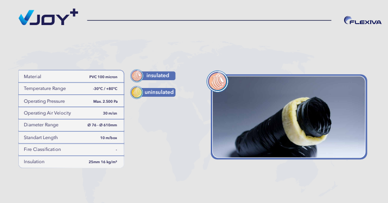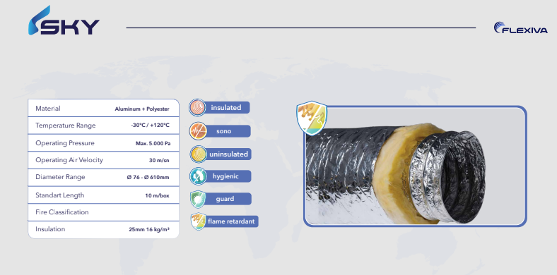 Komplett laminierte, einteilige flexible Luftkanäle sind für Heiz-, Kühl-, Lüftungs- und Abgasleitungen für mittlere und niedrige Drücke vorgesehen. Es sammelt sich nicht und staubt aufgrund des vollständig laminierten Innenkerns, des Isolationsmaterials und des Außenmantels sowie der Struktur des Isolationsmaterials.