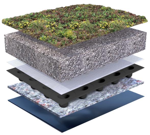 Schwammdach nach dem Purple-Roof Konzept, eine wasserspeichernde Leichtbau-Lösung für Dächer mit geringem Gefälle