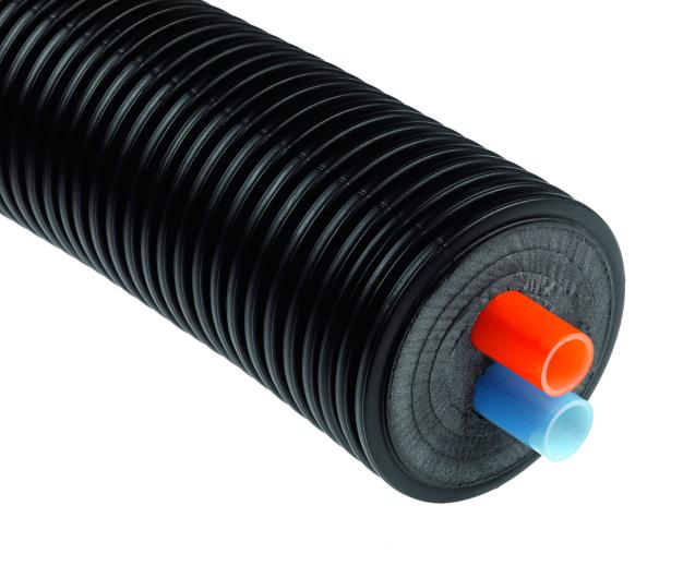 Hochflexible, vorisolierte Rohrleitungssysteme, bei denen die Mediumrohre für Vorlauf und Rücklauf in einem Mantelrohr kombiniert sind und die in erster Linie für den Transport von Heizungswasser oder anderen Wärmeübertragungsmedien in unterirdischen Verteilernetzen vorgesehen sind.