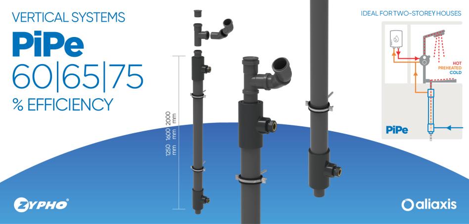 ZYPHO PiPe eignet sich für ein zweistöckiges Haus und ist eine vertikale Duschabfluss-Wärmerückgewinnungslösung, die an Duschwannen, lineare Abflüsse oder Badewannen angepasst werden kann. Das vertikale Rohr hat einen Abfluss von bis zu 25,0 l/min und ermöglicht Energieeinsparungen von bis zu 75 %, indem es einfach die Energie nutzt, die in den Abfluss fließt. Die Wärme wird vom heißen Abwasser der Dusche auf das einströmende kalte Leitungswasser übertragen. Dieses erwärmte Wasser kann entweder zur Duscharmatur, zum Warmwasserbereiter oder zu beiden geleitet werden.