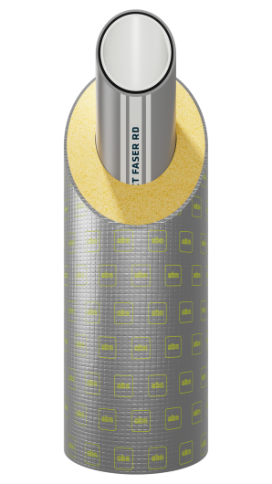 Pre-insulated system manufactured in accordance with UNE EN 253, with internal pipe made of glass-fibre reinforced PP RCT RP, pre-insulated with an intermediate layer of polyurethane foam (PUR) HFO. Aluminium jacket with reaction-to-fire B-s1, d0 for indoor installation, achieving better insulation behavior and rigidity.