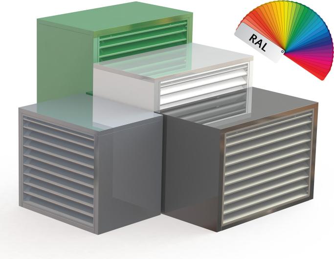 The air openings for supply and exhaust air are also designed specifically for the system. Inside the enclosure there are separating plates - they prevent short circuits between the supply and exhaust air flows. In this way, as without the enclosure, the fans can suck in or blow out unhindered, and the performance of the unit remains unchanged. The maximum pressure loss is specified as less than 25 Pa.