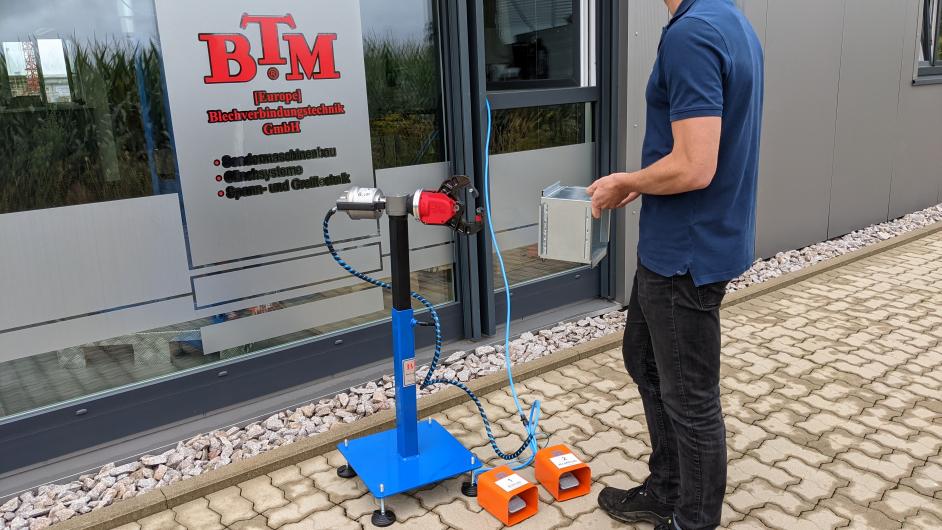 BTM has developed its HHP-R pneumatic scissors-type clinching pliers for use on collaborating robots, or cobots for short. In addition the unit can be used to mount to a pillar or direct into a machine. For this a multifunctional mount interface is desigend. Its slim design together with the large window opening and the wide opening angle offer many application possibilities.