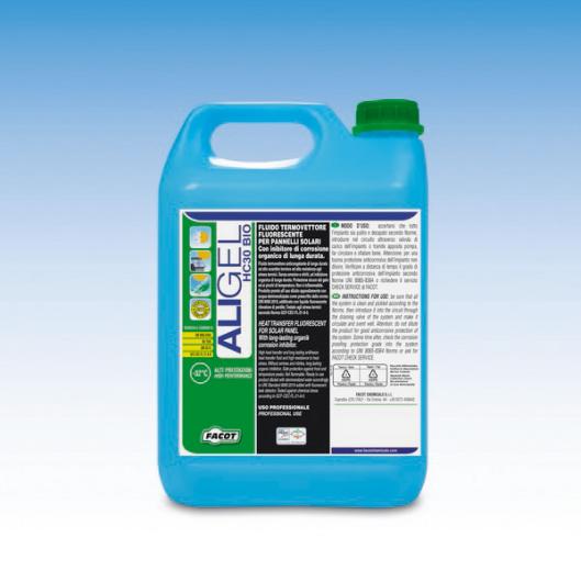 Ready-to-use antifreeze liquid added with fluorescent leak detector. Aligel HC30 Bio, as permanent PROPYLENE GLYCOL-BASED antifreeze, does not contain amines, nitrites, phosphates, silicates and borates in its inhibition pack. Contrary, it has a long-term organic inhibition and compared to the common antifreezes it has a very high (doubled) alkaline stock. Easily biodegradable. Protection of Aligel HC30 Bio is suitable for all metals, especially aluminum, his alloys and copper, that are usually the main parts of a cooling or heating system. Specific for food plants and solar panels, diluted with demineralised water as expressly required by the technical Norm UNI 8065:2019.Moreover, thanks to its formulation it is compatible with all materials constituting heating pumps.