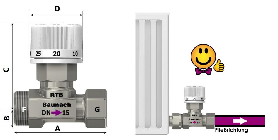 The flow rate is thus automatically adjusted to the actual heat output and the heating circuit is thus automatically hydraulically balanced, eliminating the need for manual adjustment. In addition, the heating-up time after the night setback is shortened. Opening and closing during control operation prevents the valve from becoming clogged with particles in the heating water. The room temperature is still controlled by the room thermostatic valve, but the flow is limited by the RTB valve. Furthermore, significantly less pump energy is consumed due to lower flow rates. As a practical application of such valves, we recommend installing them instead of the return screw connection of commercial radiators.