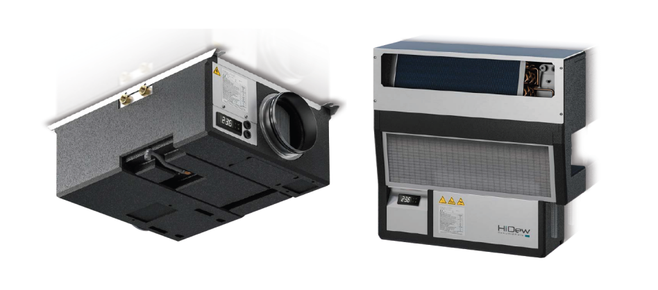 RO series horizontal ducted ceiling-mounted polypropylene dehumidifier and RV series vertical wall-mounted polypropylene dehumidifiers are designed for use in civil, residential and commercial environments (the latter being small in size) with high latent load, where 24 h/day operation is required. These are particularly suitable for buildings cooled by radiant systems, such as floors, walls or ceiling. HiDew dehumidifiers can be connected and supervised with Modbus RS485 serial port.