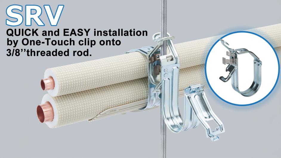 INABA DENKO's Superlock SRV enables quick and easy installation of pipe hanger supports with a "one-touch" clip mechanism that attaches to a W3/8'' threaded rod.