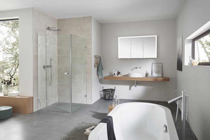 In individuell planbaren Abmessungen lässt sich die Dusche aus 8 mm starkem Glas sowohl mit Pendeltüren als auch mit nach außen öffnenden Türen kombinieren, kann freistehend, als Wandmontage oder mit verkürztem Seitenteil im Anschluss an eine Badewanne geplant werden.