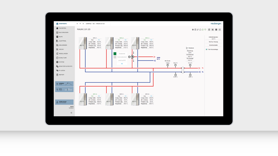ProGrafNT is Neuberger’s intuitive integrated management system for monitoring, operating and creating a visual display of building services plants of any size. All the bus systems we use are open, so they bring a high degree of flexibility when creating a visual display of a wide range of plants. Operators and facility management always know exactly what is going on thanks to the graphic display, multiple evaluation options and comprehensive logging of all automation levels. The system is infinitely scalable and can be tailored precisely to buildings and properties.