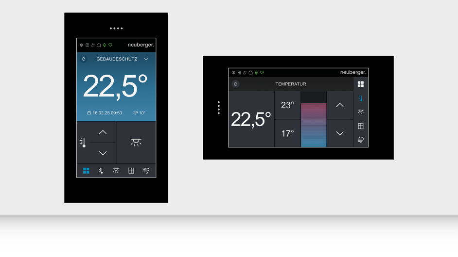 The new room control panels type RP/RC8100 are particularly characterized by their modern design as well as their innovative technology. Thanks to an extremely flexible operating and visualization concept, the panels can be used either as a pure room panel (RP8100) or as a stand-alone room controller (RC8100). Graphics, visualizations and texts are displayed particularly sharply and clearly thanks to a high-resolution, 5" color display. Operation is intuitive via fingertip (touch). Dynamic display illumination ensures energy-efficient operation, even in standby mode.