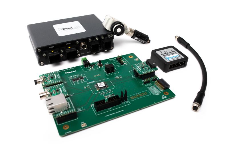The periCORE Development Kit - consisting of the periCORE Development Board and various daughter boards - is a set of tools for creating and testing customized IIoT sensor and actuator applications that can be implemented with the periCORE SPE communication module. The aim is to create a corresponding IIoT environment that enables this efficiently.