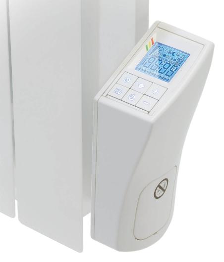 Innovative and modern digital clock thermostat for electric radiators based on fluid or dry heat transfer that can be configured with a daily or weekly program. The temperature is controlled by means of a room temperature sensor and it is based on a TRIAC with PID algorithm for a more precise temperature control. The device can be coupled to several replaceable heating element types up to 2000W. The supported heating element types are easily obtainable from the main European manufacturers. INFINITY is equipped with one of the widest white backlit displays in its category, which provides an optimal visualization of the device status, the active functions and the selected operating mode. In particular, it provides information about the output power and the actual energy consumption. In addition to the optional IR receiver for operating the device with the “Helios” and “Galaxy” remote controls, INFINITY can also be optionally equipped with a Wi-FiTM module for connecting to iOSTM and AndroidTM devices and allowing the control of the device through the dedicated App, for an improved user experience. The “Open Window Detection” function reduces energy waste and thus allows cost savings. The “Vacation” function allows deactivating the thermostat for a user configurable time interval. The “ASC” function anticipates the starting time compared to ambient temperature dynamic. The “Childsafety” function lowers the temperature of the radiating surface. The “Key Lock” mode can be used to prevent inadvertent modification to the settings. The clock thermostat allows selecting one of three predefined customizable programs. INFINITY can be connected to a Fil-Pilote control unit with 6 commands (only for Class II models).