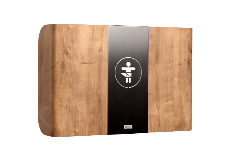 The horizontal version of our changing table series made of high-quality molded wood with a central part made of metal is ideal for customer toilets and for narrow sanitary rooms. KAWAQ only protrudes into the room when it is used and when closed again it is an attractive eye-catcher for the changing station in public spaces, as child daycare centres, cafés, doctors’ surgeries, hotels and restaurants.