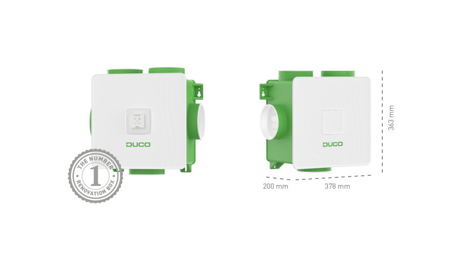 The DucoBox Reno is ideally suited for replacement projects. This smart renovation box enables the installer to exchange an outdated ventilation system up to 25% faster thanks to its compact size and smart copy function.