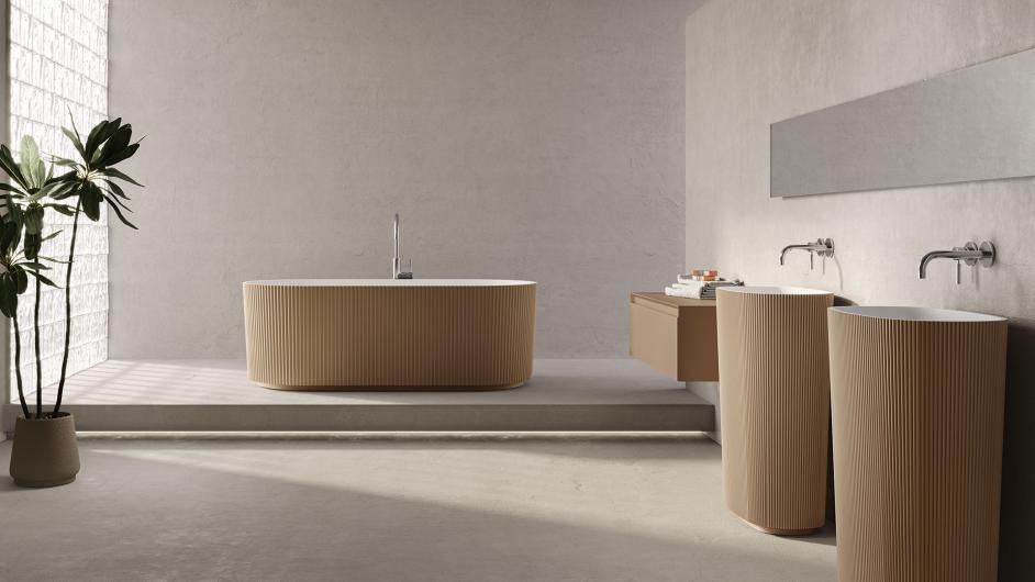 Discover Olympia, our exclusive set, composed of an elegant bathtub, a freestanding basin and a countertop basin. Its modern and sophisticated design, marked by its distinctive vertical lines on the outside, makes Olympia a true sculptural piece, standing out for its elegance and personality.